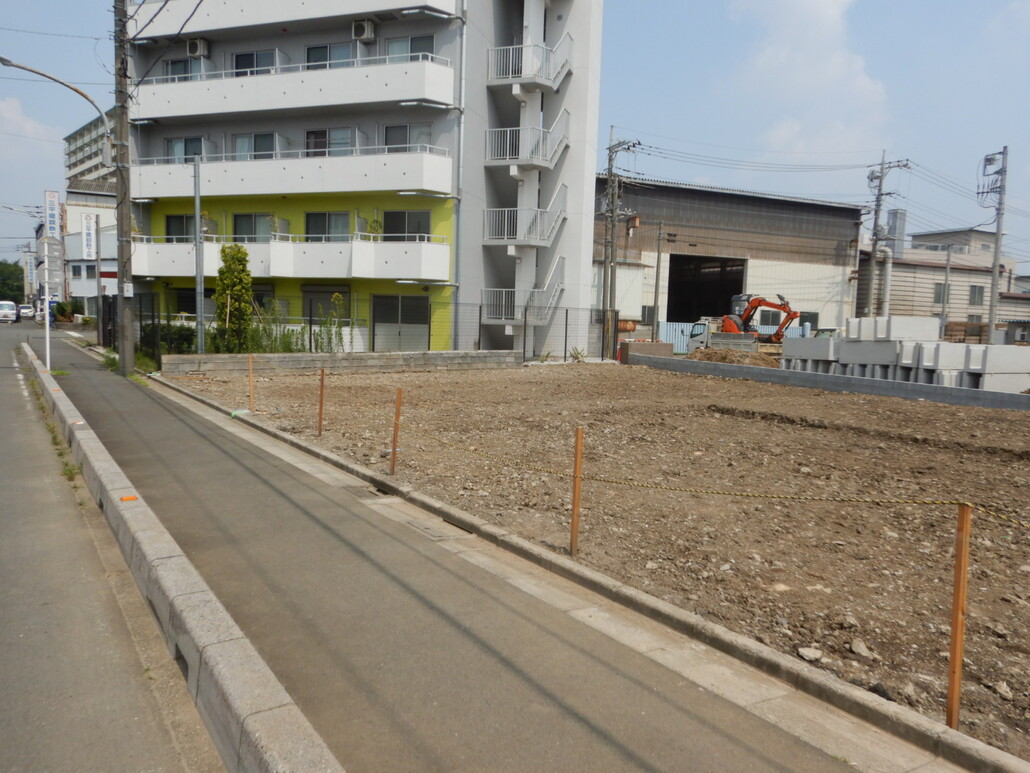 ユニット型のハウスを使用した5連棟3階建 1階を土間仕上げにし、車両も入れる倉庫とし2階3階を事務所として建築 在来工法より建築工期短縮を見込める。
