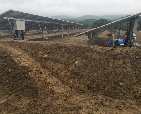 大規模太陽光発電施設建設の為の造成工事。発生した岩石を再利用した工法で工事費用を抑え、その他法面保護工事を実施。